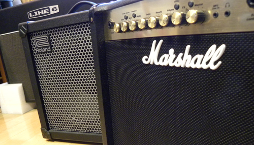 写真はエレキギター用のアンプです。手前からマーシャル、ローランド、LINE6です。LINE6は講師用ですが、ご要望があればレッスンでの貸し出しも致します。
